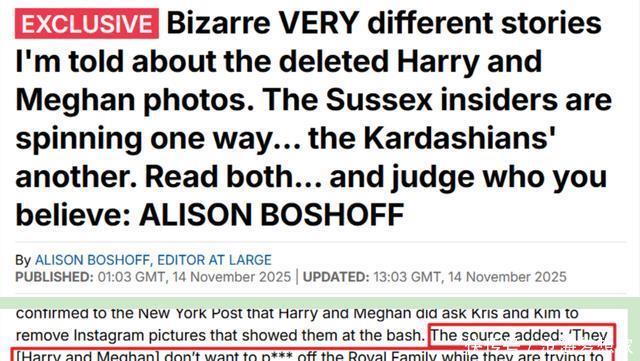 看起来似乎能把梅根洗白。显然,她知道自己犯了众怒。之前她干出种种荒唐事,犯众怒都全当看不见。现在不同了,她拙劣的公关手段证明她很在乎自己在别人眼中的形象。 《每日邮报》的报道里,一段轻描淡写的叙述暴露了真相。 有消息人士向《纽约邮报》证实,哈里和梅根确实要求克里斯和金删除他们在派对上的Instagram照片。消息人士补充说:“他们(哈里和梅根)不想在他们试图和解的时候惹恼王室。”